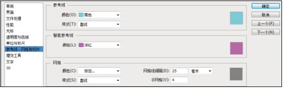 在为图像添加参考线和网格时,经常会出现因为图像、参考线和网格的颜色相似而无法清晰显示的情况,此时可以设置参考线和网格的颜色,需要时还可以设置参考线和网格的样式。其方法是:启动 Photoshop CS6,选择【编辑】/【首选项】/【参考线、网格和切片】命令,打开“首选项”对话框。在“参考线”栏的“颜色”下拉列表框中可设置参考线的颜色,在“样式”下拉列表中可设置参考线的样式;在“网格”栏的“颜色”下拉列表中可设置网格的颜色。在“样式”下拉列表中可设置网格的样式。在“网格线间隔”文本框中可设置网格线之间的距离,在其右侧的下拉列表中可设置网格线间隔距离的单位,在“子网格”文本框中可设置网格内子网格的数量。