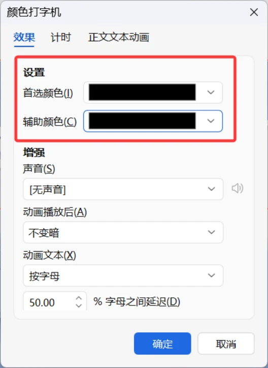 第8步:接下来会打开一个以动画效果命名的对话框,可以在【效果】标签下按需修改【首选颜色】和【辅助颜色】。