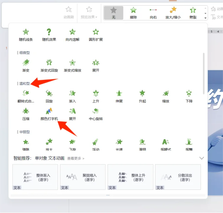 第3步:在展开的进入动画列表中,找到【温和型】中的【颜色打字机】,单击选择。