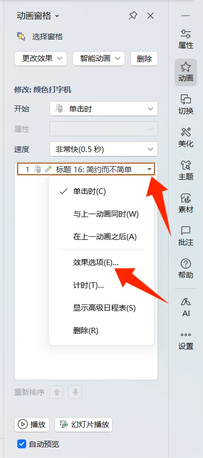 第7步:在动画窗格的动画列表框中点击颜色打字机动画右侧的下拉箭头,在下拉列表中选择【效果选项】。