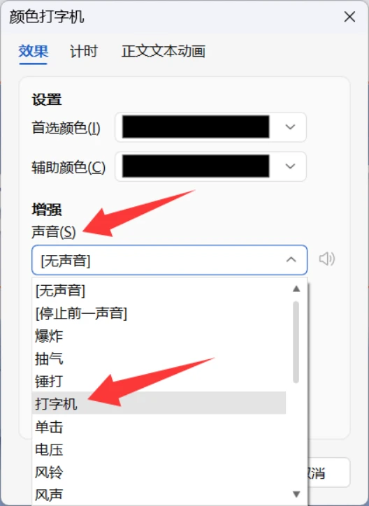 第9步:在【声音】编辑框下拉列表中选择【打字机】,为动画添加声音效果。