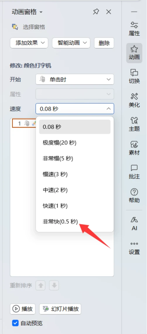 第6步:当前动画速度为【0.08秒】,这里在下拉列表中将其改为【非常快(0.5秒)】。