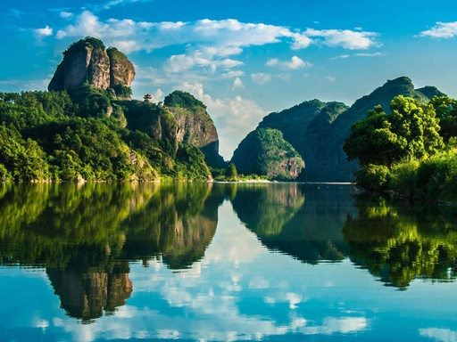 龙虎山是道教的发源地,也是江西丹霞地貌的精华所在。泸溪河如一条碧绿的丝带,缠绕着赤壁丹崖,乘竹筏漂流,看两岸赤红的崖壁倒映水中,恍若误入仙境。天师府的古色古香,与仙水岩的悬棺之谜,为这片山水增添了浓厚的道韵与神秘色彩。传说张道陵在此炼丹,丹成而龙虎现,这山水间,处处都透着道法自然的哲思。