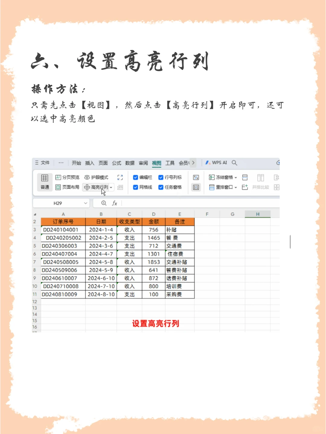 六、设置高亮行列 只需先点击【视图】,然后点击【高亮行列】开启即可,还可以选中高亮颜色