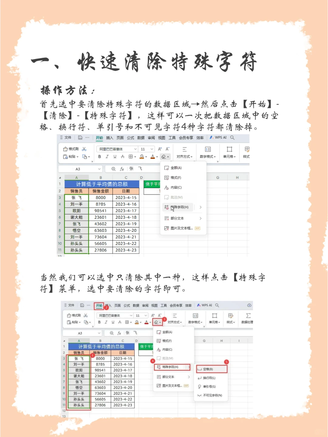 一、快速清除特殊字符 首先选中要清除特殊字符的数据区域→然后点击【开始】-【清除】-【特殊字符】,这样可以一次把数据区域中的空格、换行符、单引号和不可见字符4种字符都清除掉。