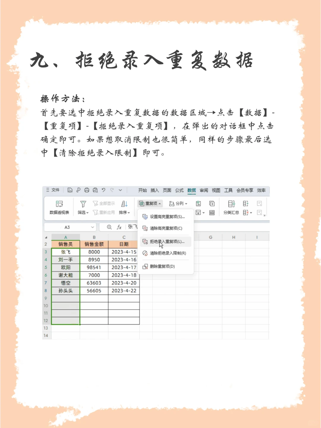 九、拒绝录入重复数据 首先要选中拒绝录入重复数据的数据区域→点击【数据】-【重复项】-【拒绝录入重复项】,在弹出的对话框中点击确定即可。如果想取消限制也很简单,同样的步骤最后选中【清除拒绝录入限制】即可。