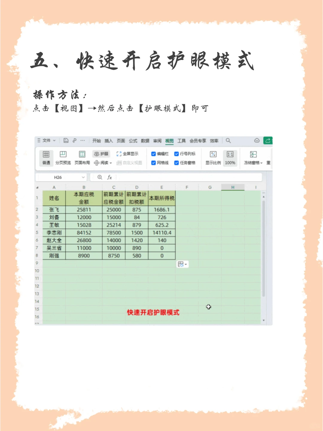 五、快速开启护眼模式 点击【视图】→然后点击【护眼模式】即可