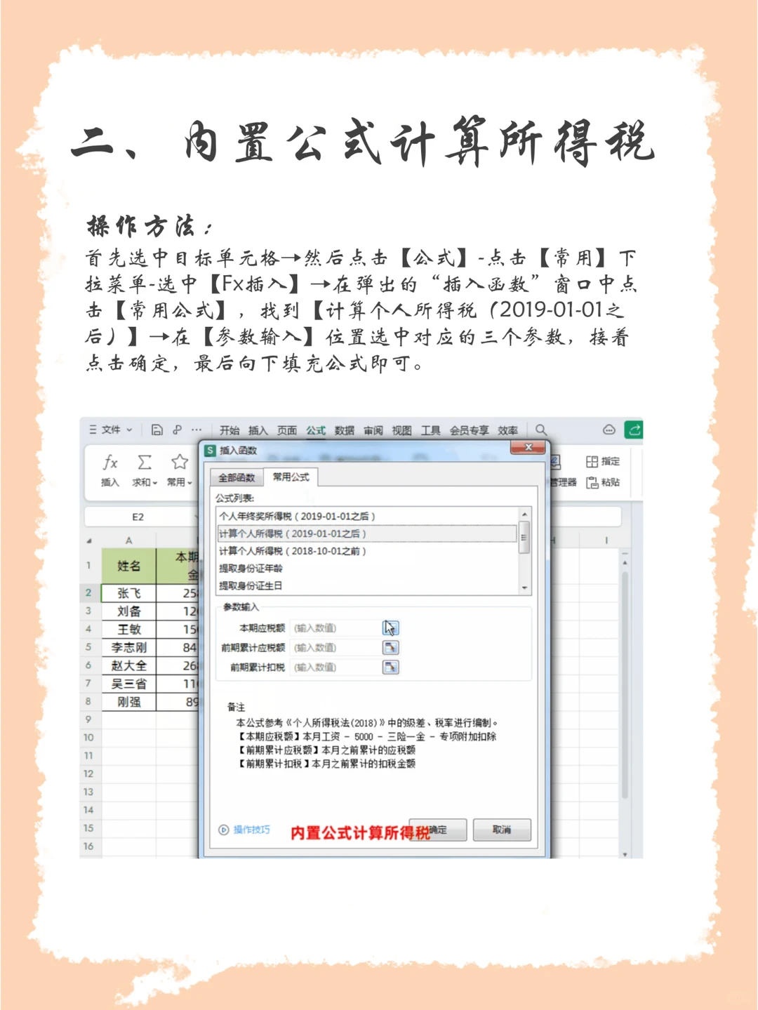 二、内置公式计算所得税 首先选中目标单元格→然后点击【公式】-点击【常用】下拉菜单-选中【Fx插入】→在弹出的“插入函数”窗口中点击【常用公式】,找到【计算个人所得税(2019-01-01之后)】→在【参数输入】位置选中对应的三个参数,接着点击确定,最后向下填充公式即可。