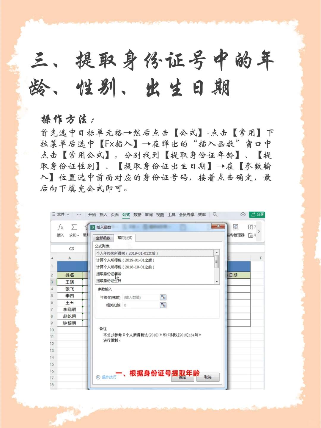 三、提取身份证号中的年龄、性别、出生日期 首先选中目标单元格→然后点击【公式】-点击【常用】下拉菜单后选中【Fx插入】→在弹出的“插入函数”窗口中点击【常用公式】,分别找到【提取身份证年龄】、【提取身份证性别】、【提取身份证出生日期】→在【参数输入】位置选中前面对应的身份证号码,接着点击确定,最后向下填充公式即可。