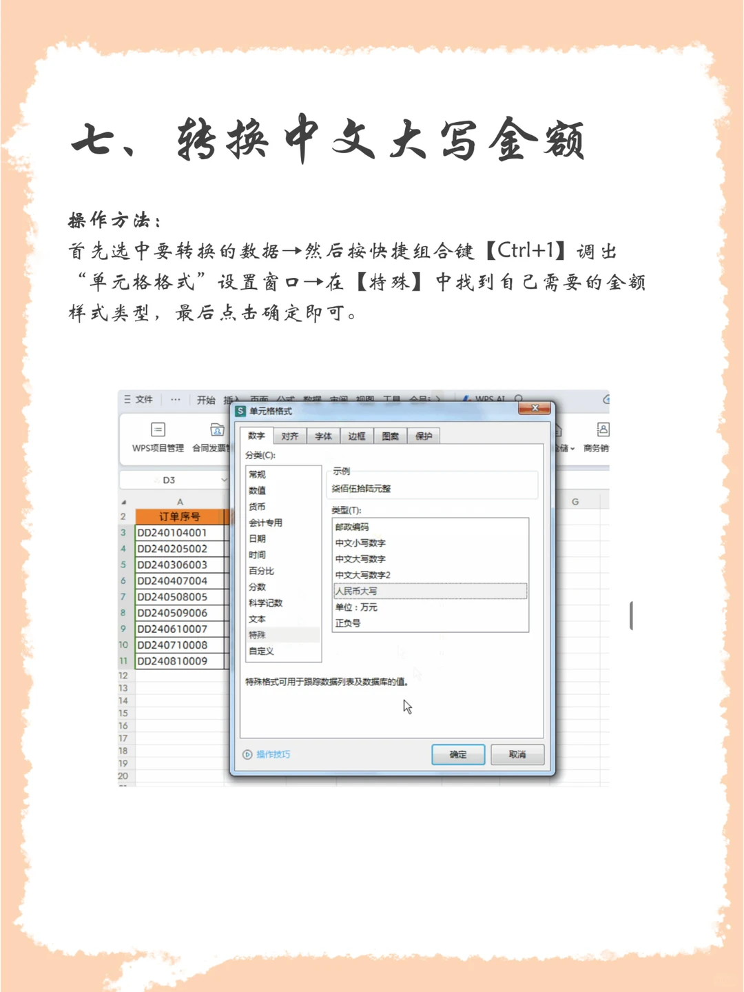 七、转换中文大写金额 首先选中要转换的数据→然后按快捷组合键【Ctrl+1】调出“单元格格式”设置窗口→在【特殊】中找到自己需要的金额样式类型,最后点击确定即可。