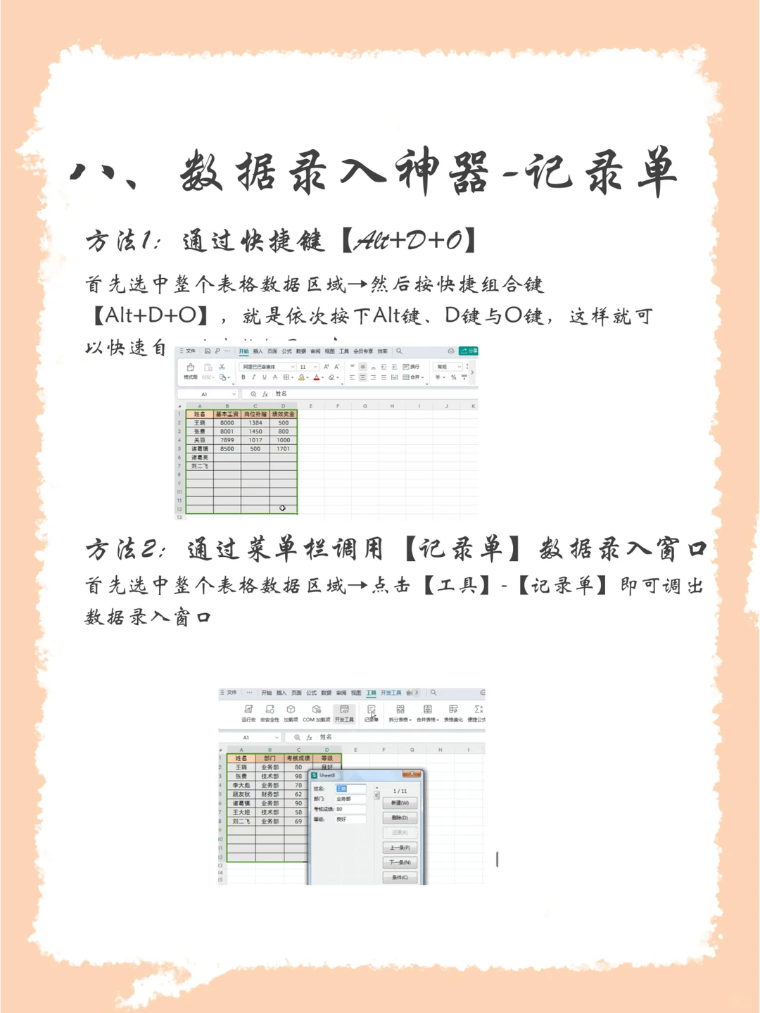 方法2:通过菜单栏调用【记录单】数据录入窗口 :首先选中整个表格数据区域→点击【工具】-【记录单】即可调出数据录入窗口