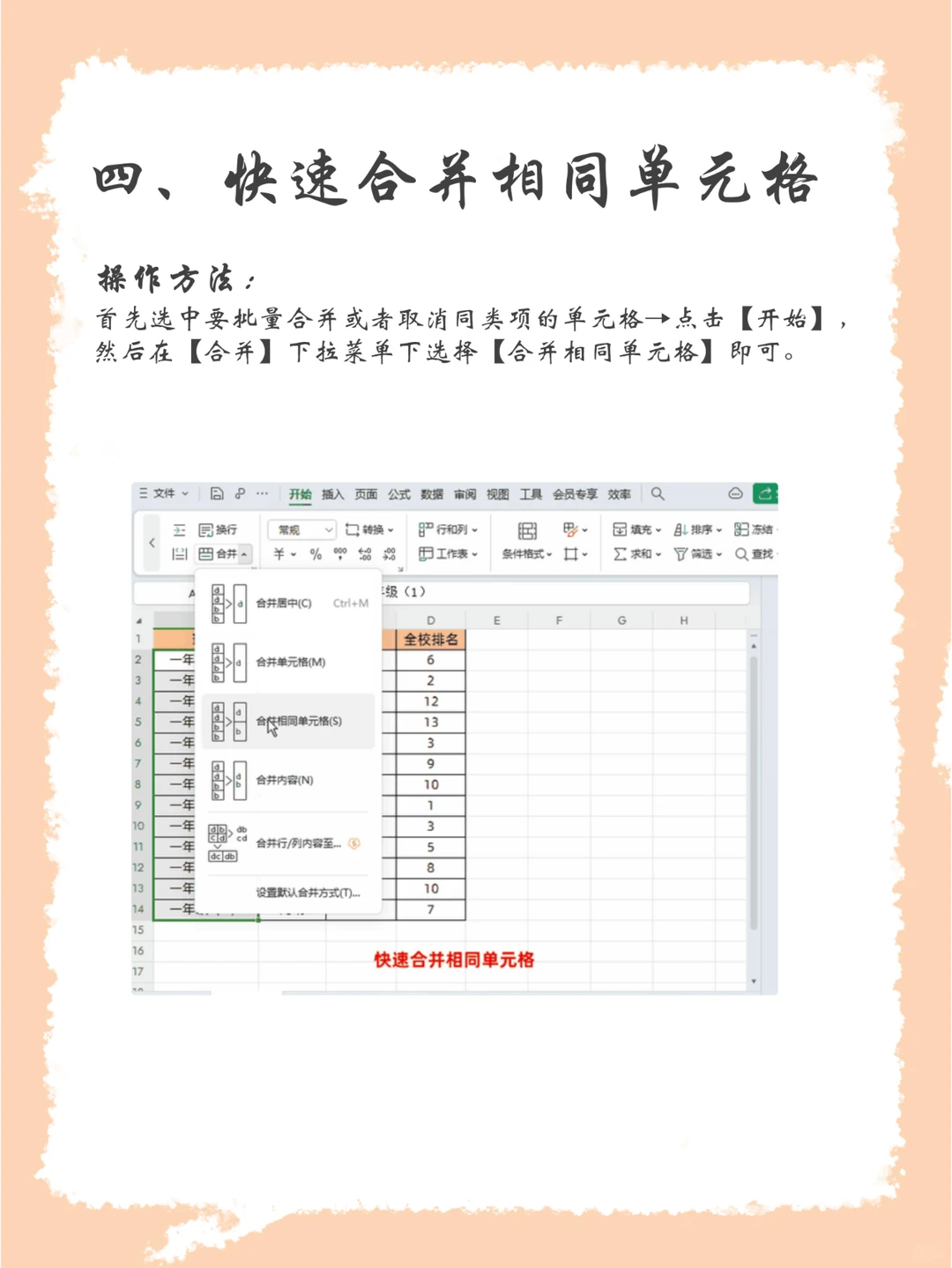 四、快速合并相同单元格 首先选中要批量合并或者取消同类项的单元格→点击【开始】,然后在【合并】下拉菜单下选择【合并相同单元格】即可。