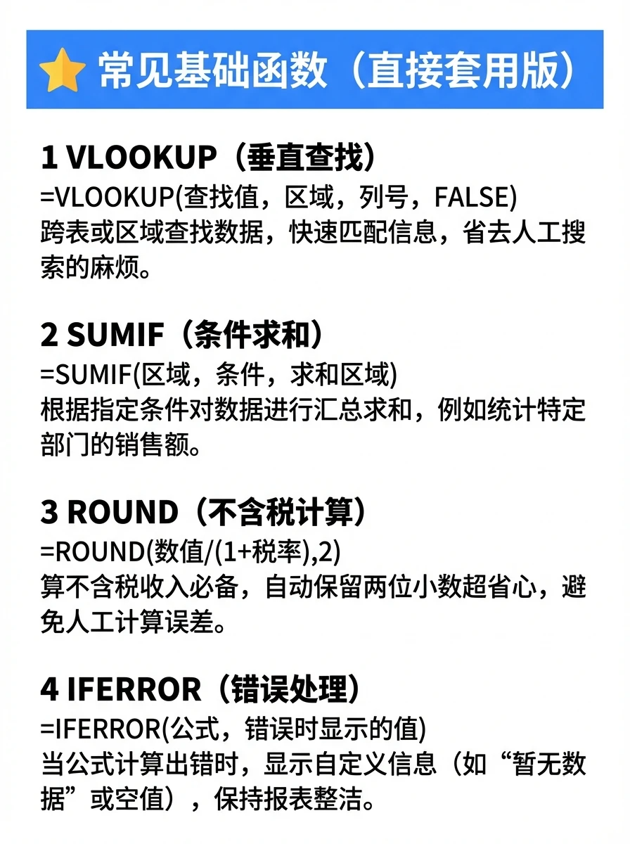 1. 不含税收入速算:=ROUND(数值/(1+税率),2) 自动留两位小数,算收入再也不用手算凑数!