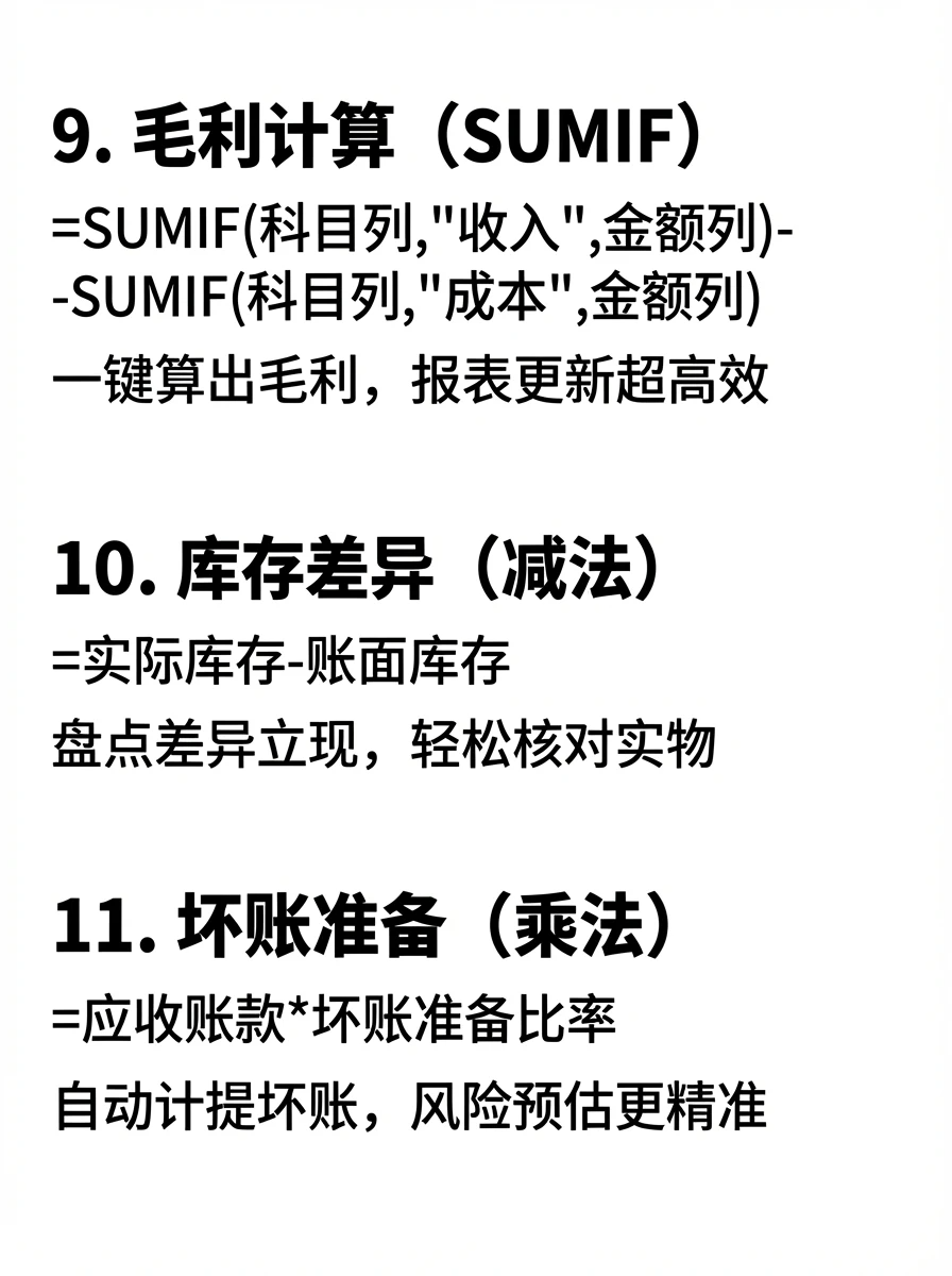 9. 毛利一键核算:=SUMIF(科目列,”收入”,金额列)-SUMIF(科目列,”成本”,金额列) 算毛利不用凑数,报表更新快到飞!