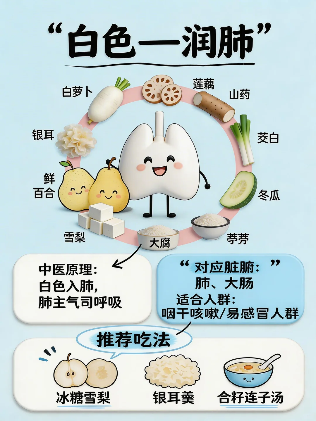 ✅ 对应食物:银耳、百合、雪梨🍐、白萝卜、山药