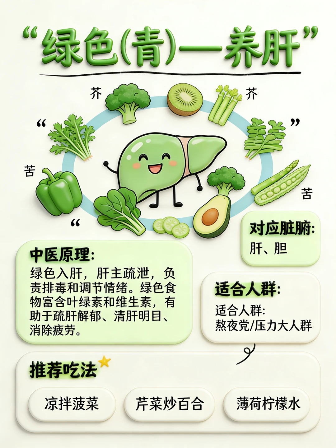 ✅ 对应食物:西兰花🥦、菠菜、芹菜、绿豆、青苹果