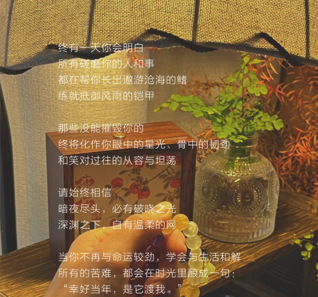 当你不再与命运较劲,学会与生活和解 所有的苦难,都会在时光里酿成一句: “幸好当年,是它渡我。”