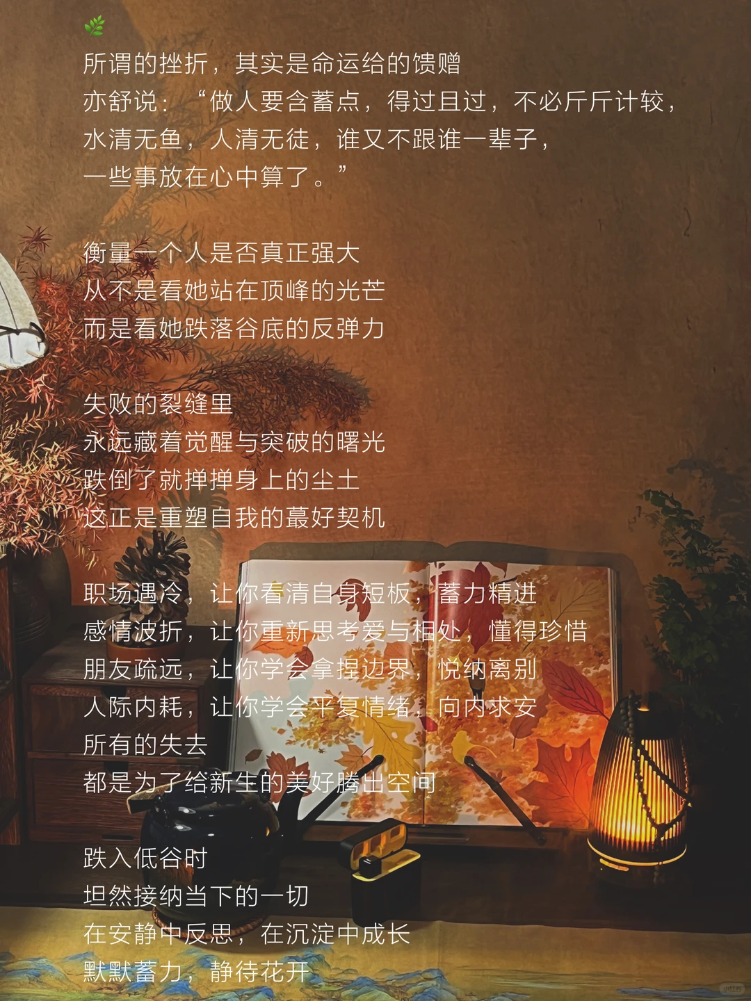 🌿 所谓的挫折,其实是命运给的馈赠 衡量一个人是否真正强大 从不是看她站在顶峰的光芒 而是看她跌落谷底的反弹力