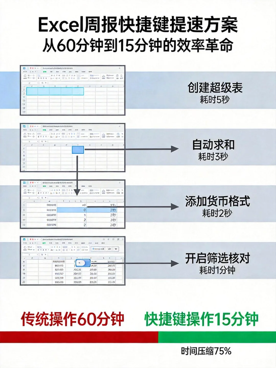 新流程: Ctrl+T创建超级表(5秒) **Alt+=**自动求和(3秒) **Ctrl+Shift+$**添加货币格式(2秒) Ctrl+Shift+L开启筛选,快速核对(1分钟)