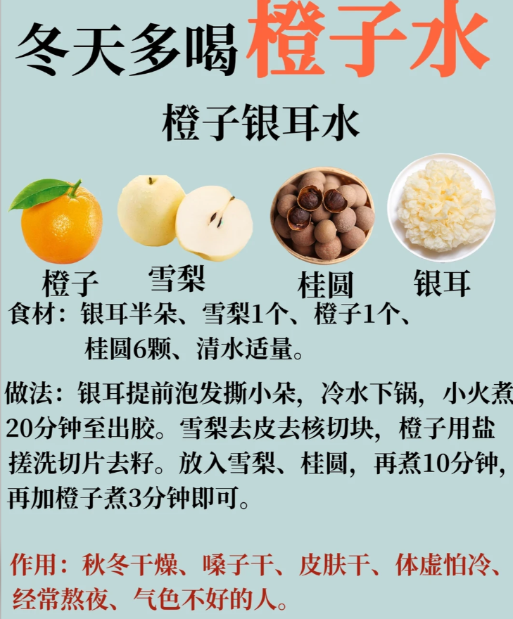 4️⃣ 橙子雪梨桂圆银耳水 · 经常熬夜,嗓子用多上火适宜