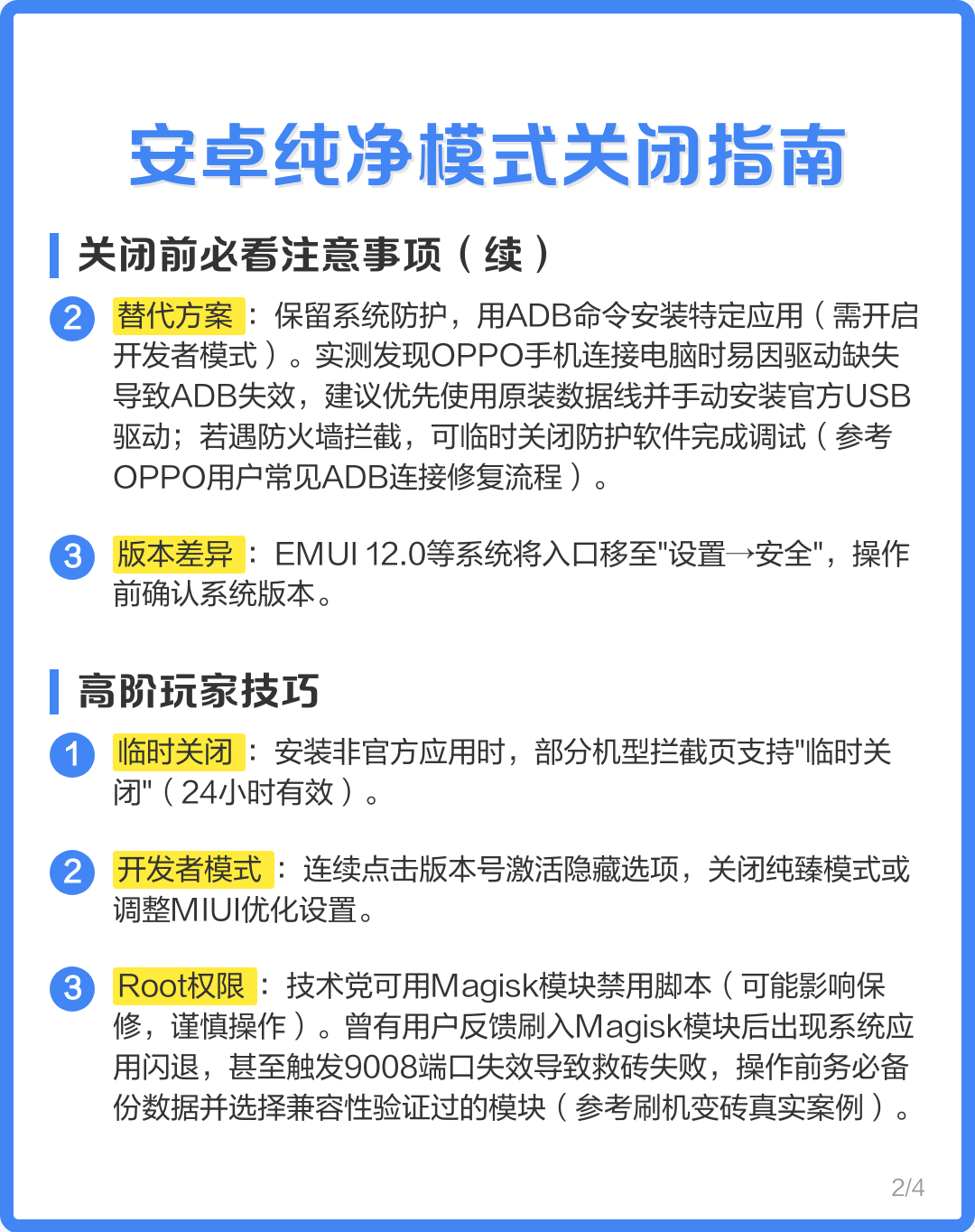 虽然纯净模式能有效防止恶意软件入侵,但有时也会给正常使用带来不便。本文将为你梳理华为、小米、OPPO等主流安卓手机关闭纯净模式的详细方法,帮你重获安装应用的自由。