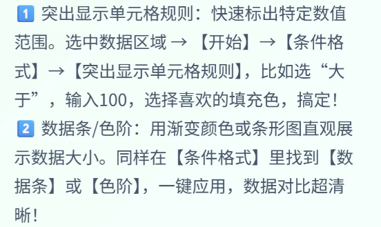 1️⃣ 突出显示单元格规则:快速标出特定数值范围。选中数据区域 → 【开始】→【条件格式】→【突出显示单元格规则】,比如选“大于”,输入100,选择喜欢的填充色,搞定!