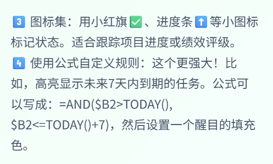 4️⃣ 使用公式自定义规则:这个更强大!比如,高亮显示未来7天内到期的任务。公式可以写成:=AND($B2>TODAY(), $B2<=TODAY()+7),然后设置一个醒目的填充色。