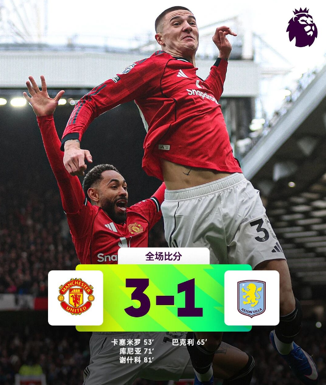 北京时间3月15日晚,2025/26赛季英超联赛第30轮在老特拉福德球场打响。在一场事关欧冠资格归属的“争三大战”中,曼联凭借卡塞米罗、库尼亚和谢什科的进球,主场3-1击败阿斯顿维拉。此役不仅是红魔复仇首回合失利的正名之战,更是队长布鲁诺-费尔南德斯加冕队史英超“助攻王”的里程碑之夜。 积分榜上,曼联甩开本场对手维拉3分,继续稳固第三的排位。