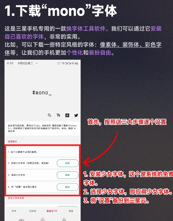 1️⃣下载”mono”字体 这是三星手机专用的一款换字体工具软件。我们可以通过它安装自己喜欢的字体,非常的实用。 比如,可以下载一些特定风格的字体:像素体、装饰体、彩色字体等,让我们的手机更加个性化和装扮自由。