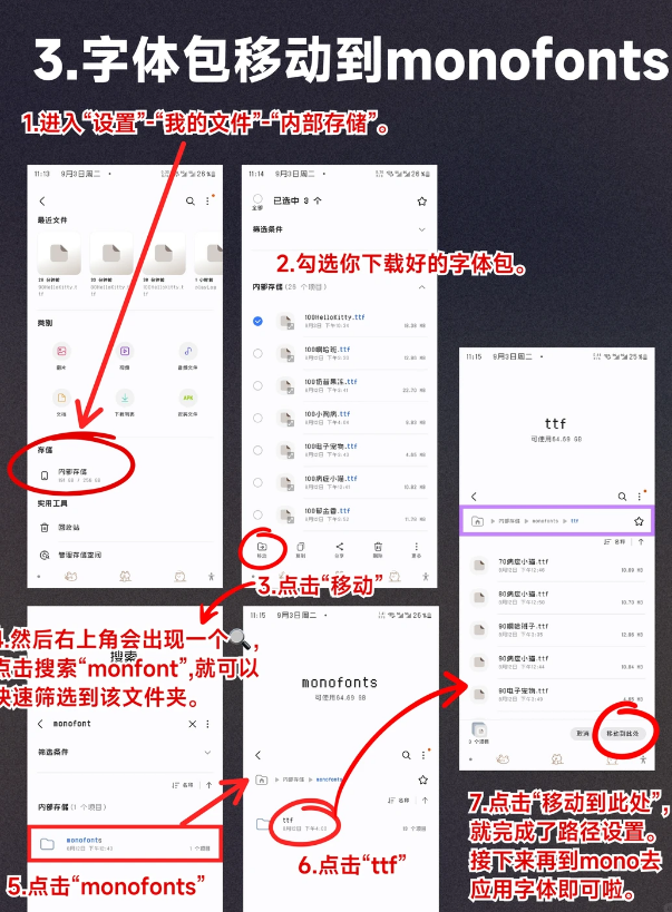 3️⃣字体包移动到monofonts 将字体包从百度网盘下载好以后,需要再将这些ttf文件移动到手机的内部存储的「monofonts」文件夹中。做好这个步骤就可以去设置自定义字体啦!