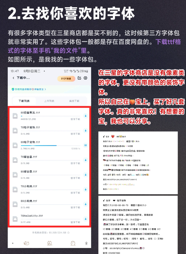 2️⃣找到你喜欢的字体 这些好看的字体包,很多分享字体的博主都是存在百度网盘的,或者也可以自己在🍑宝购买的。