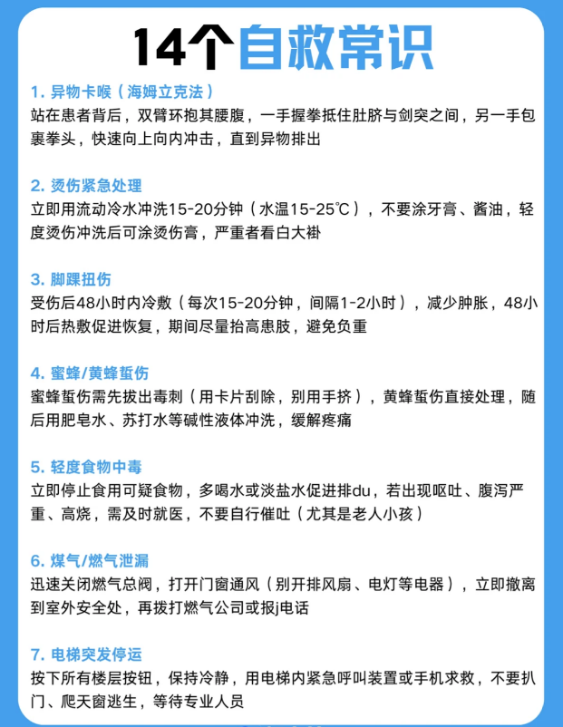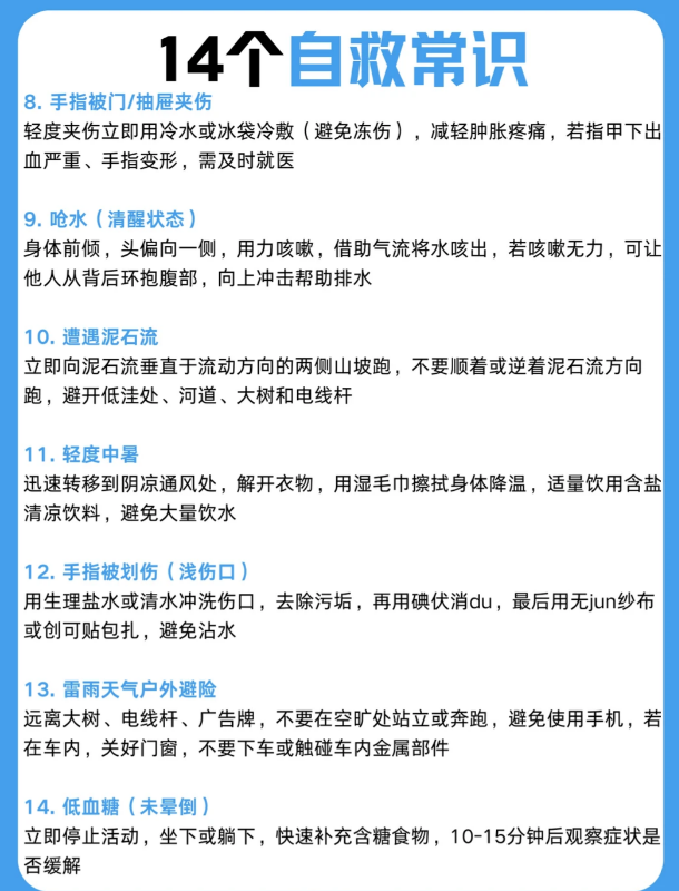 13.雷雨天气户外避险远离大树、电线杆、广告牌,不要在空旷处站立或奔跑,避免使用手机,若在车内,关好门窗,不要下车或触碰车内金属部件