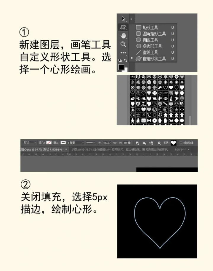 关闭填充选项 选择5像素描边 完成心形轮廓绘制