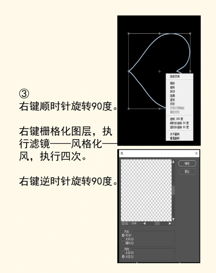 右键顺时针旋转90度 右键栅格化图层 执行【滤镜】-【风格化】-【风】 重复执行四次 右键逆时针旋转90度恢复