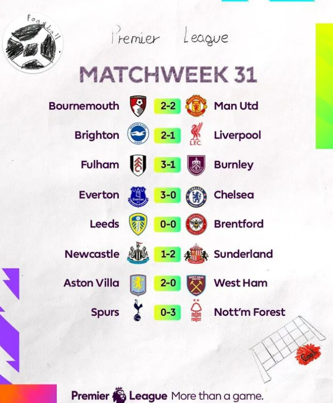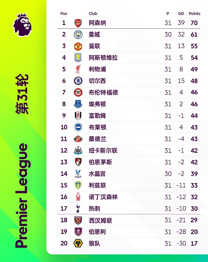 北京时间3月23日晚,本轮英超除曼城对阵水晶宫延期外,其他9场比赛全部结束。由于本周阿森纳在联赛杯决赛对阵曼城,双方本轮联赛改期进行(阿森纳比赛提前至2月19日,曼城比赛则推迟,具体时间待定)。在提前进行的那场对决之中,狼队爆冷2比2逼平领头羊阿森纳,如今枪手多赛一场情况下仍领先曼城9分;本周开打的8场英超31轮比赛中,曼联2比2被伯恩茅斯逼平仍位列第三;而阿斯顿维拉2比0轻取保级球队西汉姆联,离曼联仅剩1分;利物浦则是1比2负于布莱顿继续位居第五,切尔西0比3惨败埃弗顿,红蓝两军双双折戟。