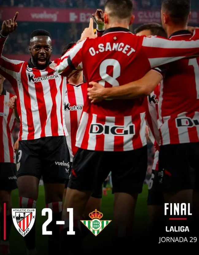 北京时间3月23日凌晨1点30分,毕尔巴鄂竞技主场迎战皇家贝蒂斯。上半场比赛,伊尼亚基·威廉斯回做,维维安远射先下一城,随后前者带球扫向门前,桑切特包抄破门扩大比分,福尔纳尔斯精彩任意球扳回一城。最终,毕尔巴鄂竞技2比1击败皇家贝蒂斯,送对手联赛5轮不胜。