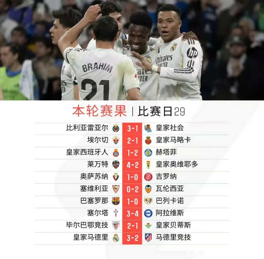 北京时间3月23日凌晨,西甲第29轮10场结束全部较量。本轮焦点对话自然是“马德里德比”,皇家马德里最终3比2力克马德里竞技报第一回合一箭之仇,继续排名第二的同时,与马竞的分差也来到了12分;巴塞罗那凭借阿劳霍的进球,1球小胜巴列卡诺继续领跑西甲;比利亚雷亚尔3比1击败皇家社会,实现了对马竞的反超;而皇家贝蒂斯本轮1比2负于毕尔巴鄂竞技,已经落后欧冠区达13分,机会愈发渺茫。