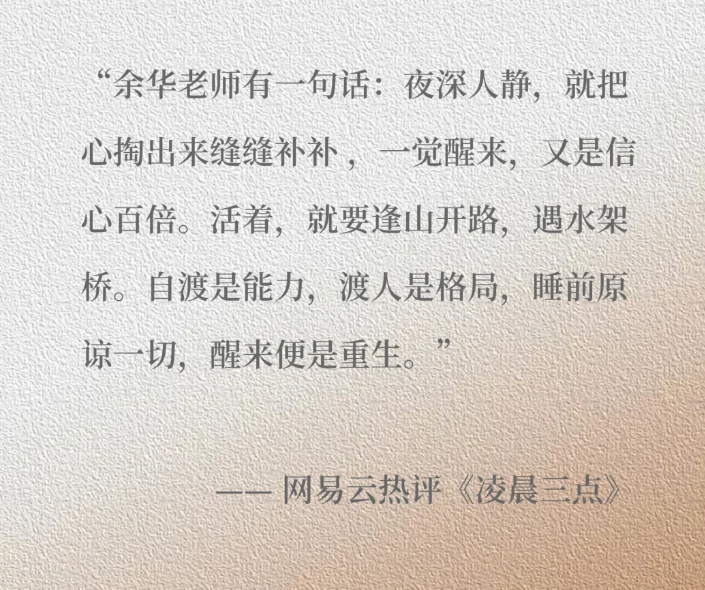 09 “余华老师有一句话:夜深人静,就把心掏出来缝缝补补 ,一觉醒来,又是信心百倍。活着,就要逢山开路,遇水架桥。自渡是能力,渡人是格局,睡前原谅一切,醒来便是重生。”