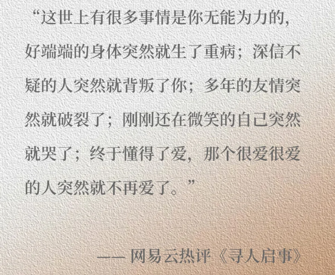 02 “这世上有很多事情是你无能为力的,好端端的身体突然就生了重病;深信不疑的人突然就背叛了你;多年的友情突然就破裂了;刚刚还在微笑的自己突然就哭了;终于懂得了爱,那个很爱很爱的人突然就不再爱了。”