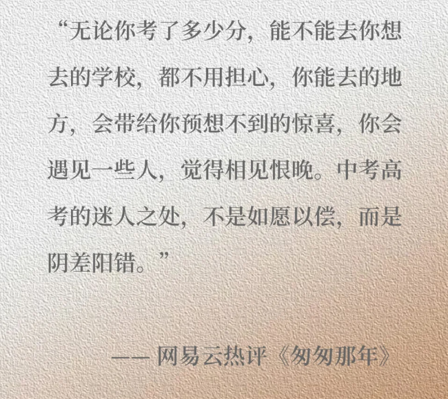 01 无论你考了多少分,能不能去你想去的学校,都不用担心,你能去的地方,会带给你预想不到的惊喜,你会遇见一些人,觉得相见恨晚. 中考高考的迷人之处,不是如愿以偿,而是阴差阳错。