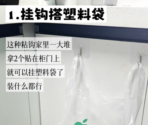 1️⃣挂钩搭塑料袋 这种粘钩家里一大堆,拿2个贴在柜门上,就可以挂塑料袋了,装什么都行。