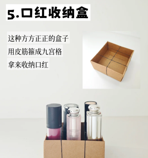 5️⃣口红收纳盒 这种方方正正的盒子,用皮筋箍成九宫格,拿来收纳口红。
