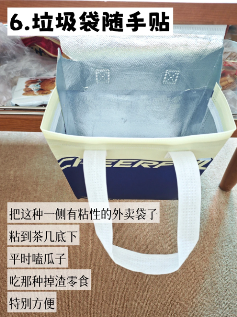 6️⃣垃圾袋随手贴 把这种一侧有粘性的外卖袋子,粘到茶几底下,平时嗑瓜子,吃那种掉渣零食,特别方便。