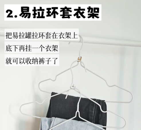 2️⃣易拉罐拉环套衣架 把拉环套在衣架上,底下再挂一个衣架,就可以收纳裤子了。