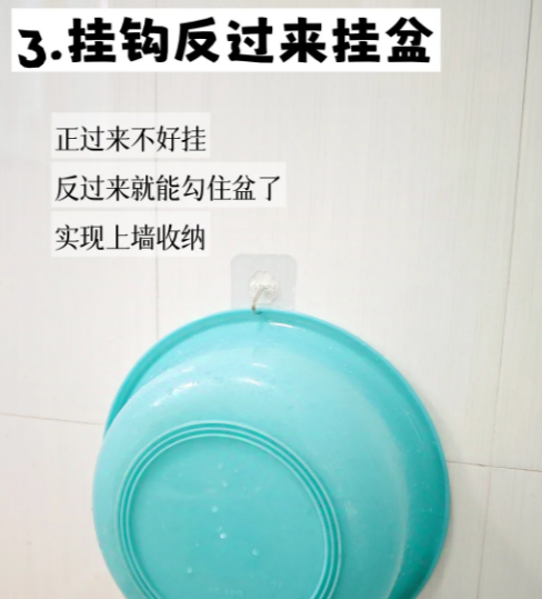 3️⃣挂钩反过来挂盆 正过来不好挂,反过来就能勾住盆了,实现上墙收纳。