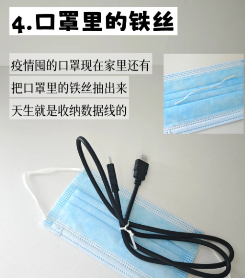 4️⃣口罩里的铁丝 ,把口罩里的铁丝抽出来,天生就是收纳数据线的。