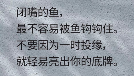 9、闭嘴的鱼,最不容易被鱼钩钩住。不要因为一时投缘,就轻易亮出你的底牌。