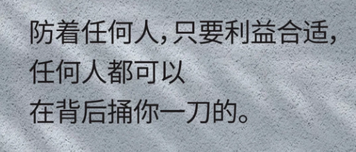 5、防着任何人,只要利益合适,任何人都可以在背后捅你一刀的。