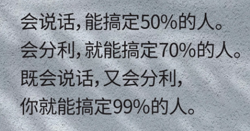 2、会说话,能搞定50%的人。会分利,就能搞定70%的人。既会说话,又会分利,你就能搞定99%的人。