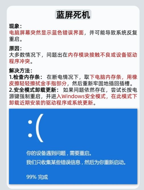 1:蓝屏死机☠️: 解决方法: 断电后重新插拔内存条,或进安全模式卸载新装驱动/更新。
